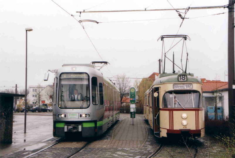 Hannover: Tw 2013 und Museums-Tw 478 in der Schleife Rethen(April 2001)